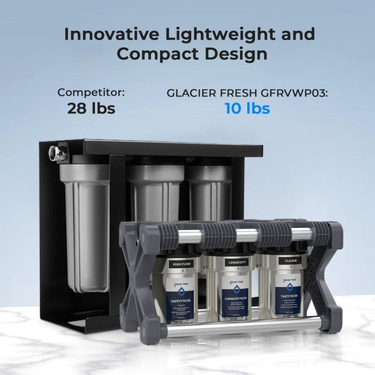 Glacier Fresh Technology RV Water Filter System, 0.2 Micron Water Filter 3-Stage System with Carbon Fiber Polycarbonate for Campers with Compact 5-Inch Filters, Premium RV Water Filtration System, Camper Vans, and Boats.